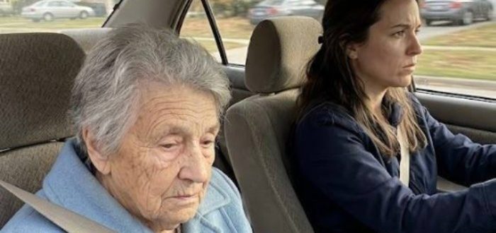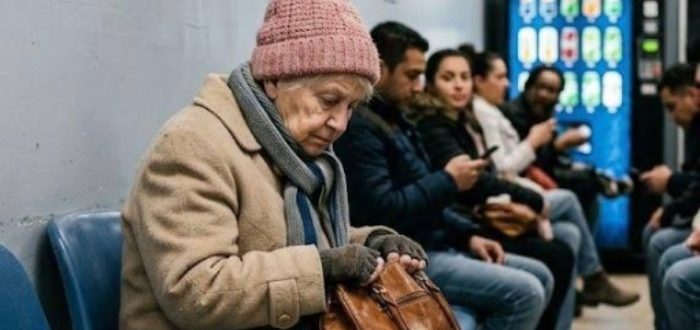 Starsza kobieta siedziała na samym końcu zimnej plastikowej ławki, mocno trzymając starą, brązową torbę. Jej płaszcz był zbyt cienki jak na panującą pogodę, szalik wyblakły, a buty wyglądały,